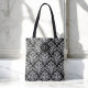 Un bolso de moda con función y estilo, este diseño presenta un bonito patrón blanco de damasco sobre un fondo negro. Personalice con su monograma deseado reemplazando las iniciales de ejemplo que se muestran en la plantilla de texto fácil de usar. Es un regalo maravilloso para cualquier mujer en su lista de regalos o un regalo especial para usted. Hay tantos usos prácticos para este tote, desde compras, viajes a la escuela, visitas a la biblioteca o el transporte de objetos a la oficina, se pueden encontrar cientos de usos para esta útil bolsa de tote.