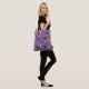 Bolsa de mano de Halloween de truco o trato linda y espeluznante. Fondo morado con un "Feliz Halloween" colorido, calabaza, fantasma, bruja, luna, patrón de gato negro.