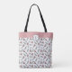 Bolsa monogramada de compras con un lindo doodle rosado de flores florales y un monograma negro personalizado sobre una franja rosa en la parte superior de la parte delantera y trasera.