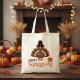 La bolsa de tote tiene un adorable pavo de Acción de Gracias en ambos lados. Turquía está usando un gorra peregrino con las palabras 'Feliz Día de Acción de Gracias' en un divertido guión marrón y naranja con un lindo acento de hoja