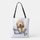 Ilustracion de acuarela de perro dulce de un perro de Labradoodle feliz y esponjoso en una bañera. Genial para los amantes del perro.