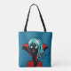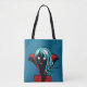 Bolsa de chica de vampiros con un ilustracion digital de un personaje gracioso de piel oscura sin muerte con ojos brillantes, pelo azul, fanáticos y una capa roja vibrante sobre fondo azul oscuro. Diseño divertido para Halloween.