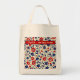 Carry your essentials in style with this patriotic floral grocery bag. The design showcases a dense botanical print of red and navy blue wildflowers across a creamy canvas background. It serves as a perfect functional gift for any mom who appreciates classic American folk art.
