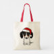 Esta bolsa de tote festiva incluye un encantador dibujo personalizado de un dachshund piebaldo con un sombrero rojo brillante de Santa. ¡Hace un regalo divertido para los Navidades para las mamás y papás doxie de los perros!