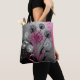 Pink, White and Black dandelion design on a black, silver and pink background tote bag.