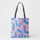 This tote bag features a soft pink base accented with expressive blue brushstrokes, creating a lively hand‑painted aesthetic full of movement and charm.