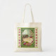Bolsa de tote para huevos de Pascua, herramientas de jardinería, etc. presenta una pintura digital original de Leslie Sigal Javorek de una escena caprichosa a través de un escaparate floral enmarcado de color verde oscuro de violetas plantadas en un conejito de cerámica. Flanqueados por 3 campos de texto personalizados que por defecto son "Spring Has Sprung!!".