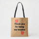 Gracias a un profesor especial por todo lo que hacen, ya sea durante las vacaciones o al final del año escolar. Esta bolsa de té ofrece una manera apropiada de expresar tu aprecio regalándole a tu profesor una gran bolsa de té para llevar artículos de ida y vuelta o usarlos para comprar comestibles. El fondo marrón claro y texturizado se parece a un patrón de tejido de canasta. Dos manzanas rojas acentúan "Gracias por ser mi profesor". Todo el texto se puede personalizar de forma rápida y sencilla para satisfacer sus necesidades.