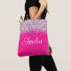 Crea tu propio bolso de tote personalizado o monogramado en todo el bolso de papel con un estilo de fuente caligráfico moderno y rizado. Este guión rizado se ve genial con su nombre o inicial. Hay otros estilos de fuente de los que elegir. El purpurina plateado es un diseño de arte digital que se imprimirá como una foto. Personalizar el fondo rosado caliente para que coincida con su color favorito.