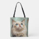 Retrato de un gatito de Ragdoll con ojos azules llamativos. El gato tiene un abrigo blanco esponjoso y lleva puesto un collar negro con el encanto de la piedra gemela azul. Los ojos del gato están muy abiertos y se centran en algo fuera de cámara, creando una sensación de curiosidad y asombro. El fondo es un azul pastel y suave con delicadas flores rosas diseminadas por todas partes, lo que aporta un toque de elegancia y capricho a la imagen.