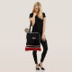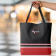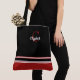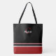 Un bolso chic y moderno con bloqueo de colores audaces y personalización elegante. Este diseño presenta rayas crujientes negras, rojas y blancas superpuestas en una silueta de lona clásica, con una inicial roja decorativa y su nombre personalizado en caligrafía blanca.