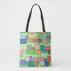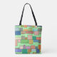 Este bolso de tote tiene un diseño moderno boho de rectángulos adheridos a líneas horizontales de varios tamaños y colores boho.