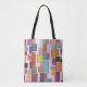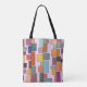 Este bolso de tote tiene un diseño moderno boho de rectángulos adheridos a líneas verticales de varios tamaños y colores retro.
