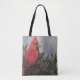 Este tote ofrece una sentada cardinal masculina grande en una rama frondosa. La parte posterior del tote es un rojo elogioso. Éste es el regalo perfecto para los amantes del pájaro y de naturaleza.