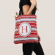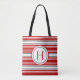Este diseño de bolsos de tote presenta un hermoso patrón rayado rojo, gris y blanco con un monograma doble con círculo. Ideal para celebrar con los colores del equipo, o sólo todos los días diversión de verano. Hace un gran regalo. Creado por Simply Farmhouse Press.