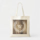 Los laureles blancos rústicos y los tablones de madera de grano imprimen una bolsa de tote monogramada.