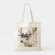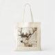 Esta finca de tote presenta un ilustracion rústico de reno con corteza de pino y baya roja en sus cuerdas. El fondo tiene un aspecto vintage y texturizado con escritura manuscrita. Perfecto para añadir un toque vacacional acogedor a tus regalos.