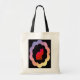 Este diseño se hizo usando Photoshop. El fondo es un marco negro con un corte que muestra un arcoiris de colores. Un círculo negro con un borde de vieiras muestra un gato diseñado con un tinte rojo. Este tote se puede utilizar para muchas actividades diferentes. Disponible en diversos mangos de color.