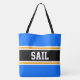 Este diseño deportivo, atlético, presenta texto en negrita de SAIL dentro de una franja negra de centro ancha realzada con pinstripes blancas y amarillas contra rayas exteriores de color azul brillante. El texto se puede personalizar.