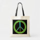 Esta bolsa de tocador muestra el patrón circular del símbolo de paz internacional. Los colores azul, verde y amarillo sobre un fondo negro crean un patrón abstracto geométrico dramático.