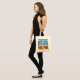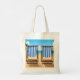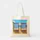 An illustration from a photograph of two blue and white striped sun loungers on a beach themed background printed on both sides of a tote bag.