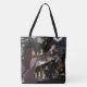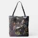 Hallow Eve, arte original. Señora extendiendo su mano para que este murciélago blanco pueda prestarle. Tumba, murciélagos, fantasmas, velas por todas partes. **Este diseño se ajusta al tamaño más grande del tote.