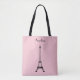 Esta bolsa de tote rosa y negro está diseñada con un tema parisino en mente, mostrando la Torre Eiffel en el centro con un nombre personalizado o texto en la parte superior. ¡Hace un gran tote para cualquiera que ame Francia o París!