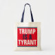 Trump es un tirano. Como se muestra, texto blanco y azul en un rectángulo rojo. Fondo azul de medianoche.