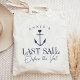 Da la bienvenida a los invitados a tu despedida de soltera náutica o de navegación con estas adorables bolsas de mano personalizadas. El diseño presenta una ilustración de un barco azul marino coronada por un pequeño corazón, con dos líneas de texto personalizado debajo; mostrado con "Última Vela Antes del Velo". Agrega el nombre de la novia curvado en la parte superior. Los colores se pueden cambiar para que coincidan con tus colores preferidos utilizando la herramienta de diseño de Zazzle.