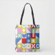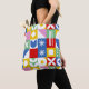 Una colorida bolsa reutilizable sobre su hombro. La bolsa es la estrella de la escena: un audaz diseño de estilo patchwork compuesto por bloques geométricos brillantes, cada uno con su propio patrón juguetón.