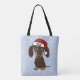 Esta bolsa de tote festiva incluye un encantador dibujo personalizado de un dachshund de chocolate con un sombrero rojo brillante de Santa. Personalizar con nombre u otro texto. ¡Hace un regalo divertido para los Navidades para las mamás y papás doxie de los perros!
