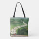 ¡Hermosas bolsas de tote de todo el mundo! ¡Disponible en dos estilos y dos tamaños! Viaje de ilustracion vintage e imagen de transporte con una autopista con coches que recorren algunos campos verdes en la pintoresca América.