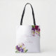 Esta romántica bolsa de tote de boda tiene un diseño floral. El fondo es un blanco sobrio y elegante con violetas color morado. Un delicado ramo de flores violetas aparece en la parte superior izquierda, con los nombres de la pareja impresos a continuación.