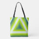 Esta imagen es un diseño abstracto geométrico con triángulos concéntricos anidados. Los triángulos se organizan de manera que se crea una ilusión de profundidad y perspectiva, atrayendo la atención del espectador hacia el centro. La paleta de colores está formada por varios tonos de verde (desde verde azulado profundo hasta rojo vivo y verde claro) que se combinan a la perfección para formar un gradiente visualmente llamativo. La simetría y la repetición le dan un ambiente dinámico y moderno, haciéndolo adecuado como arte digital, fondo o incluso diseño impreso.