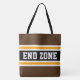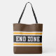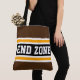 Este diseño deportivo presenta el texto de negrita END ZONE dentro de una banda de carreras horizontal en el centro, de color negro, resaltada con pinstripes blancas flotantes y amarillas doradas contra las rayas exteriores marrones atléticos. El texto se puede personalizar.