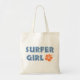 La imagen apenada ofrece el texto azul - chica de la persona que practica surf, con un hibisco anaranjado a la derecha.