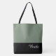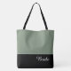 Este hermoso bolso tote de moda muestra la palabra "Novia" en color de texto blanco sobre negro con la parte superior del bolso en verde Willow personalizado. Tiene mucho espacio para texto personalizado. Los gráficos y el texto están en ambos lados de este bolso tote. Asa negra. Personalice aún más o compre como se muestra.