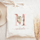Esta elegante bolsa de mano presenta un gran monograma de la letra "M" en hoja de oro rosa falso, decorado con un ramo floral vintage marfil recortado con follaje verde y dorado rosa. Personalízala con su nombre en escritura a mano en oro rosa, con florituras al principio y al final. ¡Es un regalo perfecto para las damas de honor! Otras letras del alfabeto están disponibles en nuestra tienda Zazzle. (Para mantener las florituras, reemplace solo las letras del nombre.)