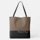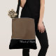 Esta encantadora bolsa tote de moda muestra la frase "Dama de honor" en color de texto blanco sobre negro con la parte superior de la bolsa tote en marrón Latte personalizado. Tiene mucho espacio para texto personalizado. Los gráficos y el texto están en ambos lados de esta bolsa tote. Asa negra. Personalice aún más o compre como se muestra.