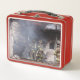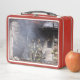 Una caja de almuerzo con una foto de bomberos luchando contra un incendio.