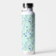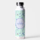 Esta bonita botella de agua tiene un fondo azul acuático y verde, con unas flores moradas delgadas por todas partes. Se proporciona una plantilla para que ponga su nombre e inicial.