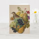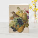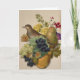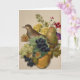 Un pájaro descansa sobre uvas y peras en colores otoñales con flores sobre un fondo dorado. Las hojas de otoño coloridas se mezclan por todas partes.