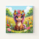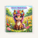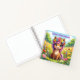 Un lindo cuaderno de bocetos personalizado al que puedes añadir el nombre de tu hijo. Guarda todos sus bocetos en este dulce cuaderno sentimental. Un adorable pony con un anillo de flores moradas y rosas en la cabeza. Un ilustracion de aire dulce y caprichoso que es luminoso y colorido en rosa, azul, amarillo y violeta.