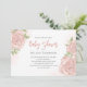 Este diseño presenta flores de rosa botánico de flores rosadas, bonito vegetal botánico, una simple invitación a la ducha de bebé, una minimalista foto moderna de sangre completa, una elegante moda femenina, un elegante guión de caligrafía a la moda, detalles estadísticos de estadísticas de natalidad, un diseño clásico y chic de estilo tradicional, un jardín de flores rosa rosa rosa rubí, una adorable invitación a la ducha dulce.