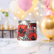 Envases de flores. Camionetas rojas en un jarrón blanco sentado sobre una mesa. personalizados de historietas de bonito.