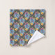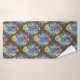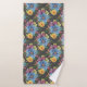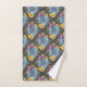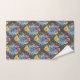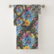 El diseño del conjunto de toallas de baño de bonito tiene grandes flores azules primarias pintadas con otras más pequeñas de color amarillo marrón, violeta y rosa, todo ello sobre un fondo gris carbón que le da un aspecto oscuro y elegante.