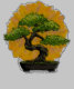 Un hermoso ilustracion de un bonsai que se sienta en una olla negra contra un fondo circular amarillo brillante.