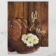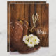 La temática ecuestre informal pero elegante Cowboy Boots, Daisies y Horse Bit Country Western Menu se puede personalizar con los detalles de la comida que se sirven en su rústica fiesta de compromiso con rancho, almuerzo con ducha de novia, recepción matrimonial o brunch boda añadiendo ensalada o primer curso, segundo curso y postre o tercer curso. Este encantador menú de boda equino personalizado presenta una pintoresca fotografía floral de un par de botas de vaquero, un ramo de flores de margarita blancas y amarillas, un collar de perlas blancas, un trozo de caballo y riendas de cuero con un fondo de granero marrón. Ideal para una celebración casual de fiesta de granero al estilo de una granja.