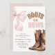 Celebra la anticipación del género de tu pequeña con nuestra atractiva invitación a revelar el género de Boots o Bows. Perfecto para un género occidental o rodeo revelar fiesta, esta invitación presenta una hermosa proa rosa y un par de botas de vaquero que simbolizan el clásico tema de "Él o Ella".