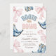 Celebra la anticipación del género de tu pequeña con nuestra atractiva invitación a revelar el género de Boots o Bows. Perfecto para un género occidental o rodeo revelar fiesta, esta invitación presenta una hermosa proa rosa y un par de botas de vaquero que simbolizan el clásico tema de "Él o Ella".
